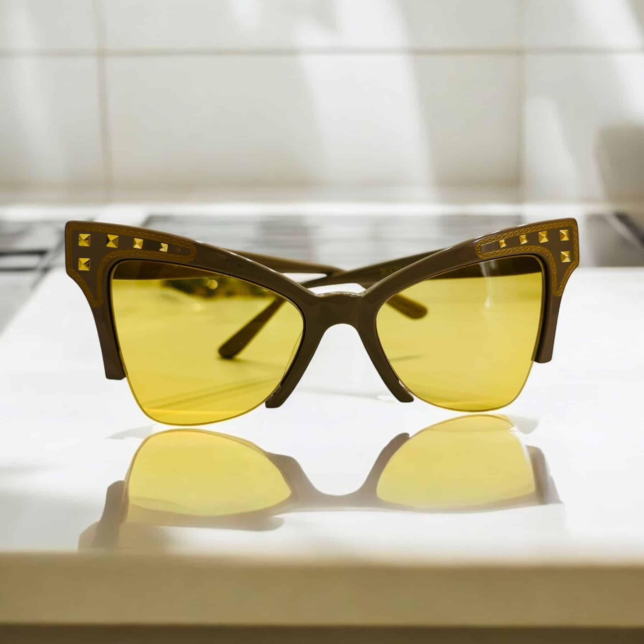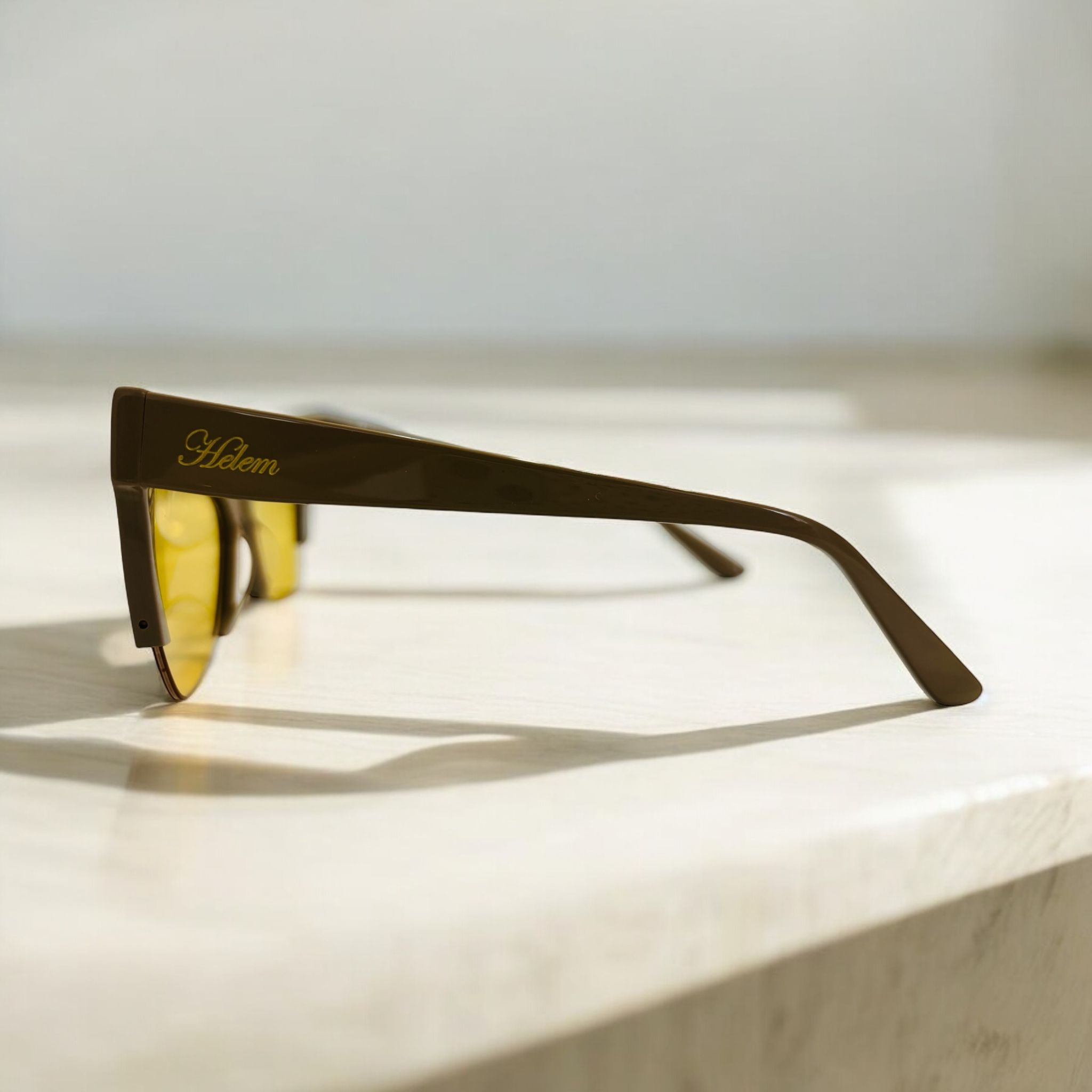 Gli occhiali da sole Marianna , di colore beige ,la lente gialla  identifica la gioia ,come la mia amica ….la forza di un uragano ……..